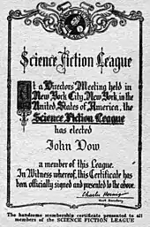 The Science Fiction League was one of the earliest associations formed by science fiction fans.[1] It was created by Hugo Gernsback in February 1934 in the pages of Wonder Stories, an early science fiction pulp magazine. Gernsback was the League's "Executive Secretary", with Charles D. Hornig its "Assistant Secretary". The initial slate of "Executive Directors" included Forrest J. Ackerman, Eando Binder, Jack Darrow (Clifford Kornoelje), Edmond Hamilton, David H. Keller, P. Schuyler Miller, Clark Ashton Smith, and R. F. Starzl.[2]