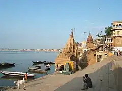 Scindia Ghat (Hindi: सिंधिया घाट) is one of the ghats in Varanasi and borders Manikarnika,[1] a place of Hindu cremation, to the north. At this ghat, a tilted Shiva temple can be found lying partially submerged in the Ganges River and it is argued that this ghat collapsed under its own excessive weight. The ghat is named after the Scindias, who built it in 1830. Above the ghat, several of Kashi’s most influential shrines are located within the tight maze of alleys of Siddha Kshetra (Field of Fulfillment). According to mythology, Agni, the Hindu God of Fire, was born here. Hindu devotees propitiate at this place to Vireshwara, the Lord of all heroes, for a son.