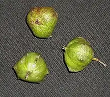The fruit is a 3-lobed capsule up to 25 mm in diameter.[3] The fruit opens by splitting into three roughly circular parts, with each of the 6 valves bearing a shortly-conical appendage (horn[3]) 2 mm long.[1] When ripe; the fruit are green or coppery in colour, and leathery in texture.[3] Each of the cocci bears one seed enclosed in a 2 mm thick woody endocarp. The seeds are 7 × 5 mm in size, ovoid-ellipsoid in shape, smooth surfaced, and dull, pale greyish-brown flecked and spotted with darker brown.[1]