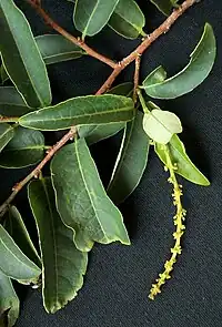 Small yellowish flowers are produced on terminal spikes.[3] The flowers are either all male or with 1 female flower at the base of the spike.[1]