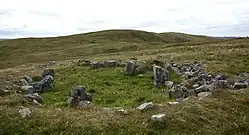 The Scord of Brouster is one of the earliest[1] Neolithic farm sites in Shetland, Scotland.[2] It has been dated to 2220 BC with a time window of 80 years on either side.[3] It comprises three houses, several fields surrounded by walls, and a cairn.[1] A sign by the Scord of Brouster states that the climate of Shetland became wetter towards 1500 BC, and that peat forming near the fields eventually forced the farmers to permanently abandon the site.[1] The site was excavated by Alasdair Whittle in the late 1970s, because he wanted investigate on early agricultural settlement in Britain in a remote part of the country, unspoilt by modern development.[4]