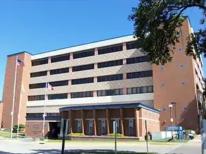 The present courthouse was built from 1955 to 1956 at a cost of $1,480,000.[11] Disagreements over location, design, and cost resulted in delays and redesigns.[3] Iowa Governor Leo Hoegh spoke at the dedication on October 21, 1956.[1] In 1983 the courthouse and the Scott County Jail were joined together by an addition to the jail, whose original building was constructed in 1896. A ten-year $13.8 million renovation project began in 1998 after many county offices were moved from the courthouse into a new Scott County Administrative Center.[13] Court related offices were moved into newly renovated areas during the project. In 2004 a bond referendum was passed by county voters to expand the size of the jail. The $29.7 million expansion was opened in 2007[14] and expanded the courthouse and jail complex with a 75,000-square-foot (7,000 m2) addition.[15] The new entrance pavilion provided security screening to the entire courthouse for the first time.[16]