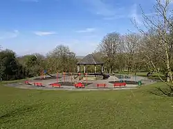 Several curving paths were created, running beside, crossing over, and overlooking the watercourse, with a bandstand, several footbridges and shelters built around the site. A two-storey stone lodge (since demolished) was also constructed next to the main entrance. The park was officially opened on 8 August 1895, and a bowling green was added two years later.[6]