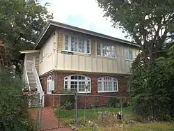 The front door opens into an antechamber which narrows to become a hallway. To the left of the front door is a small door opening from the former maid's room. The hallway terminates in a vestibule, shaped as a square on 45 degrees, with doors on each of the four sides leading into various rooms. To the left is the kitchen and dining room, to the right, the sitting room and second bedroom. The main bedroom and bathroom are located off the hallway. An enclosed porch is found on the northern side of the bedrooms, connected by half glass, French doors. A service area and back stairs are located on the southern side of the kitchen and bathroom and provides access between the former maid's room, bathroom and kitchen.[1]