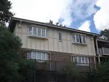Scott Street Flats is a two storey, timber and masonry Tudor Revival building located overlooking the Brisbane River at Kangaroo Point. The building contains two flats, each occupying a full floor with identical floorplans. Almost square in plan, the building has a pyramid shaped, terracotta tiled roof with overhanging eaves. It is constructed of red face brick at ground level and has a half timbered appearance at upper level, achieved through the use of fibro-cement cladding with timber cover strips. The plain exterior of the building is simply elaborated with arched brick openings at ground floor level, small panels of timber lattice and a timber corbel between the two floors. The western elevation facing the river has four faceted bay windows and downpipes with prominent rainwater heads at each end.[1]