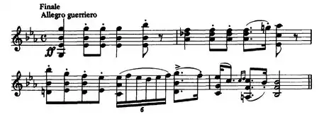 It is a four-movement fantasy on Scottish folk melodies. The first movement is built on "Through the Wood Laddie".[3] This tune also appears at the end of the second and fourth movements. The second movement is built around "The Dusty Miller", the third on "I'm A' Doun for Lack O' Johnnie", and the fourth movement includes a sprightly arrangement of "Hey Tuttie Tatie", the tune in the patriotic anthem "Scots Wha Hae" (with lyrics by Robert Burns).