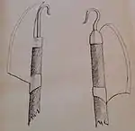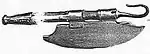 The crossed weapons in the traditional sword dance is not limited to basket-hilted broadswords. Dancing around crossed Lochaber axes is mentioned as an older version of the dance.[16] The Broadsword indicated the basket-hilted sword worn by officers of Highland Regiments and sometimes miscalled the claymore, which is a large two-handed weapon. The original version of the Broadswords Dance is described in MacLellan’s book: the steps, four strathspey and one quick-time, and the drill for marching on and off a dancing stage are less elaborate than those seen in some present day forms of the dance. It is not an "Old Thyme" dance and it is not regimental in origin.[17]