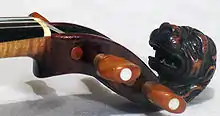 A scroll is the decoratively carved beginning of the neck of certain stringed instruments, mainly members of the violin family. The scroll is typically carved in the shape of a volute (a rolled-up spiral) according to a canonical pattern, although some violins are adorned with carved heads, human and animal. The quality of a scroll is one of the things used to judge the luthier's skill. Instrument scrolls usually approximate a logarithmic spiral. Although many references assert that the instrument scroll closely follows the golden spiral (a specific form of the logarithmic spiral) this assertion is demonstrably false.[1] Scrollwork is a common feature of Baroque ornament, the period when string instrument design became essentially fixed.