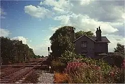 Scrooby was a railway station on the Great Northern Railway running between Retford and Doncaster. The station served the small village of Scrooby until closed in 1931, though an excursion stopped in 1938.[3] Sunday trains ended in 1924.[4] In 1897 it had a booking office, waiting room, stationmaster's house, signal box and 5 passenger trains a day each way, but no goods facilities.[5] About 1978 the signal box was replaced by Doncaster power box.[6]