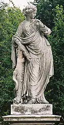 | 13 | Hygieia | Joseph Baptist Hagenauer | Hygieia was the goddess of health and cleanliness.[21] She was the daughter of Asclepius, the god of healing,[21] and Epione, the goddess of soothing of pain. Hygieia had five sisters who also represented aspects of Apollo's healing: Panacea the goddess of universal remedy, Iaso the goddess of recuperation, Aceso the goddess of the healing process, and Aglaea the goddess of beauty.[22] | ![]() |