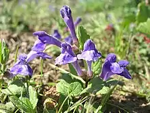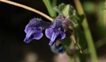 Scutellaria tuberosa is a species of flowering plant in the mint family known by the common name Danny's skullcap.[1] It is native to western North America from Oregon through California to Baja California, where it is widespread throughout the mountain and coastal regions; it is absent from the deserts and the Central Valley of California. It can be found in forest and woodland habitat, and a variety of open habitat types, often appearing in areas recently cleared by wildfire. It is a perennial herb producing an erect stem or cluster of stems up to about 25 centimeters tall from a root system with tubers. The stems are coated in short, spreading hairs. The oval leaves are oppositely arranged. The lowest leaves are borne on short petioles. Flowers emerge from the leaf axils. Each flower is held in a calyx of sepals with a large ridge or dome-shaped appendage on the upper part. The tubular corolla is one to two centimeters long and has a large upper and lower lip. The upper lip is folded into a beaklike protrusion and the lower has three wide lobes. The corolla is deep purple-blue, usually with a white patch or mottling on the lower lip.
