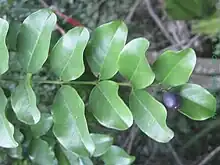 Leaves are ovate to obovate in shape, often notched at the apex, but always with mucronulate tip, opposite with usually entire margin, sometimes wavy.[4]