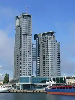 The two-tower skyscraper Sea Towers is a mixed-use complex on the Gdynia waterfront, Poland, 50 metres from the main port of Gdynia developed by Invest Komfort SA. Tourist attractions such as the beach, boardwalk and retired Polish WWII naval ship ORP Błyskawica (lightning) are all within walking distance. Construction commenced on 10 May 2006 and was completed on 28 February 2009. At 143.6 metres, Sea Towers is the 14th tallest building in Poland and the second tallest residential building in the country. Apartments are for sale, and the complex can double as a hotel. There is a viewing terrace on floor 32, the top floor of the taller tower.
