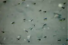 The coastal species lay their eggs close to the water surface on rocks, plants, and other structures near the shore, while the oceanic species attach their egg masses on floating objects such as cuttlebone and feathers.[1][2] Each female lays 1–20 whitish or translucent eggs that each measure about 1 mm (0.04 in) long and half that wide. They may hatch just above or just below the surface.[2] In recent decades the oceanic species have been documented laying their eggs on floating plastic waste, which potentially may disrupt the marine food chain, as the Halobates (now with access to more surfaces for breeding) may become far more common than usual.[9] In one extreme case, a plastic gallon jug was found to be covered by 15 layers of eggs, equalling about 70,000 in total.[2]