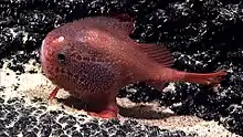 They have large, globose bodies and short, compressed tails, and are covered with small, spiny scales. The largest are about 30 cm (12 in) in length. During their gill ventilatory cycle, Chaunacidae are able to take in high volumes of water, increasing their total body volume by 30%.[4] The first dorsal fin ray is modified into a short bioluminescent lure which dangles forward over the mouth, which is turned upwards so as to be nearly vertical. The sensory canals of the lateral lines are especially conspicuous.[5] Chaunax have modified fins which resemble legs.[6] It was also found that they use these modified pelvic fins to assist with maneuvering their swimming, especially when as an escape response.[7]