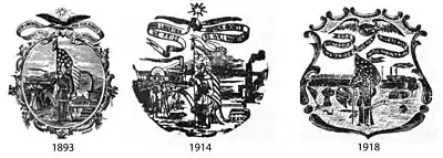 The Territorial seal was well liked as a simple image of the state and was used on state documents well into the 1860s, even after it had been officially replaced. According to the originator of the seal, territorial secretary William B. Conway, "It is regarded as perfectly expressive of a distinct idea, intimately associated with the history of the delightful country which we have the happiness to inhabit... The slightest examination of the seal will disclose to the Honorable Council the eagle, the proud and appropriate emblem of our national power, bearing in its beak an Indian arrow, and clutching in its talons an unstrung bow; and while the idea thus delicately evolved is so well calculated to make the eye glisten with patriotic pride, and cause the heart to beat high with the pulsations of conscious superiority, it nevertheless presents a touching appeal to our manly sensibilities."[7]
