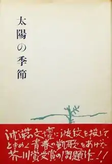 Season of the Sun (太陽の季節, Taiyō no Kisetsu, published in English as Season of Violence) is a Japanese novel written in 1955 by Shintaro Ishihara, who later became a politician and was governor of Tokyo for 13 years from 1999 to 2012. It is the source of the name of the rebellious taiyōzoku (太陽族) youth culture which emerged after World War II.[1] The novel won the 1956 Akutagawa Prize.[2]