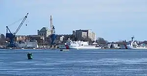 View of Seavey's Island from Prescott Park in Portsmouth, NH. The large building is the former naval prison.