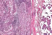 | Micrograph of a sebaceous carcinoma (left of image) metastatic to the parotid gland (right of image). H&E stain. | |