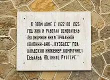 A plaque on the 1922–1925 home of Rutgers in Kemerovo, noting him as an engineer and founder of the Kuzbass Autonomous Industrial Colony