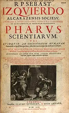 Sebastián Izquierdo was born on 29 January 1601 at Alcaraz, in the Castilian province of Albacete.[2] He joined the Jesuits on November 17, 1623 and studied at the Jesuit college in Alcalá de Henares and the prestigious Colegio Imperial de Madrid.[3] He taught Philosophy and Theology at Alcalá, Murcia and Madrid and became Rector of the colleges of Murcia and Madrid. The environment at these colleges was brimming with renewed interest in the work of the Catalonian philosopher Ramon Llull emphasizing theoretical mathematics, combinatorics, and methodology of science.[4] In 1659, he published in Lyon his monumental philosophical work Pharus scientiarum (The Lighthouse of Sciences), which was widely disseminated throughout Europe. Two years later, he left for Rome in order to attend the eleventh General Congregation of the Society of Jesus, at which time he was named assistant to the Superior General for Spain and the West Indies. In Rome he befriended among others the well-known German polymath Athanasius Kircher.[3] In 1664 he published there the first part of his Opus Teologicum, and in 1670 the second part. He died in Rome on 20 February 1681.[3]