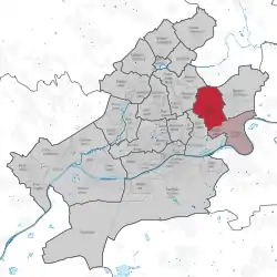 Location of Seckbach (red) and the Ortsbezirk Ost (light red) within Frankfurt am Main | |