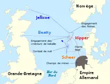 French map of the Battle of Jutland (1916) showing (in black) the approximate area of German minefields in the North Sea