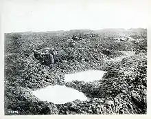 The assault began at 5:40 a.m. on the morning of 26 October.[29] The troops were preceded by a rolling barrage, edging forward in lifts of 50 yd (46 m) every four minutes, permitting the infantry to keep up while negotiating the mud. On the left flank, the 8th Canadian Infantry Brigade captured Wolf Copse and secured its objective line but was ultimately forced to drop a defensive flank 300 yd (270 m) back to link up with the 63rd (Royal Naval) Division, the flanking division of the Fifth Army. In the centre, the 9th Canadian Infantry Brigade found the German barbed wire to be well cut by the preliminary artillery bombardment and within an hour captured the Bellevue pillboxes.[30]