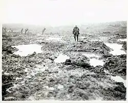 In the low ground west of the Passchendaele Ridge, three months of constant shelling had blocked the watercourses that normally provided drainage. When rain began falling on the night of 4 October—which continued intermittently for the next three days—the battlefield once again became a quagmire, making movement extremely difficult. Gough and Plumer told Haig that they favoured ending the campaign on account of the change in the weather and general state of the battlefield but the decision was made to continue the offensive for winter positions on higher ground.[4][lower-alpha 1] The Battle of Poelcappelle (9 October) and First Battle of Passchendaele (12 October) were costly for both sides and failed to achieve any appreciable advance opposite Passchendaele, although they did provide a slightly better starting line for another attack.[13] The four divisions of the Canadian Corps were transferred from the Lens sector to the Ypres Salient to capture Passchendaele.[3] The Canadian Corps relieved the II Anzac Corps on 18 October, along the valley between Gravenstafel Ridge and the high ground at Passchendaele and began planning the offensive. It was virtually the same front as had been occupied by the 1st Canadian Division back in April 1915.[14]