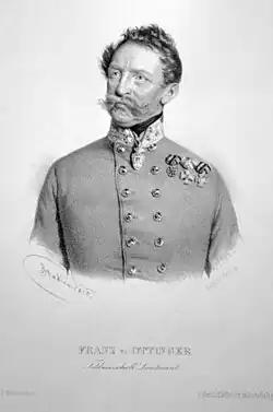 The Imperial garrison stationed in the town, in case of an enemy attack, had to be supported by the Austrian troops placed along the Pest-Szolnok railway line, Abony, and Cegléd area, especially the Ottinger cavalry brigade which was in Abony.[6] However, Major General Franz Gramont was of the opinion on 31 January that as long as the bridge at Cibakháza was in Hungarian hands, the Hungarians could cross and attack the garrison from Szolnok from the flank at any time.[6] And since the cavalry led by Major General Ferenc Ottinger could hardly arrive in time, so in the case of a retreat Szolnok's garrison brigade could easily lose its baggage, ammunition, and supplies.[6] On 24 February, the Imperial Brigade led by Ottinger tried to capture the Hungarian bridgehead from Cibakháza, in order to prevent the Hungarians from crossing the river by destroying it.[2] For the operation, he committed 3-3 companies of the 6th and 7th Infantry Regiments, 3 Battalion, 3rd Infantry Regiment, 16th Congreve Rocket Battery, 5th Cavalry Battery, and 1st Twelve Pounder Battery.[2] The Imperial artillery was unable to outgun the Hungarian artillery, which fired accurately from a covered position, and after a while the Imperial artillery run out of ammunition.[2] Ottinger tried to resolve the problem by personally leading his infantry columns against the bridge, but they were broken up by the grapeshots fired by the Hungarian artillery turned back. The Honvéds repulsed the attack brilliantly.[2] Despite this, there were no major changes in the Imperial positions; only that at the end of February Gramont's troops were replaced at Szolnok by Major General Leopold Edler von Karger's brigade (about 4600 men and 15 guns).[6]