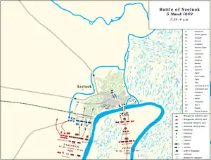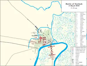 The plan for the capture of Szolnok was drawn up by Lieutenant-Colonel Kleinheinz.[7] The plan was for Damjanich's division to attack the enemy from the flank, cut off the retreat of the imperial forces towards Cegléd and try to push them in the Zagyva stream.[10] Meanwhile, the Vécsey Division launches the main attack from Szandaszőlős, from the direction of the Tisza bridge, against the bridgehead on opposite bank in Szolnok.[10] According to the plan, Vécsey had to start the attack in order to attract the attention of the Imperial troops and thus enable Damjanich to surround the enemy.[10] At the same time, a detachment consisting of the 28th Honvéd Battalion, 2 hussar companies, and 8 cannons was to be sent to Csongrád to organize and support, after crossing the Tisza, a popular uprising there.[7]