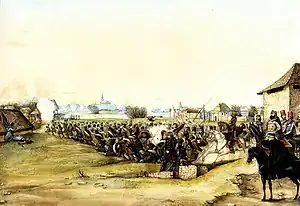 The advancing Hungarian troops followed the retreating opponent and essentially took the new order of battle adapting to this situation.[30] On the left flank, Nagysándor probably sent the Colonel's Squadron of the 2nd Hussar Regiment and half of the 1st Cavalry Battery under Lieutenant Tóth against the Ban's Hussars, while the bulk of the cavalry and the 8th Cavalry Battery advanced towards the chapel.[30] Wysocki halted the left flank of the center (the jägers, the 9th and 28th Honvéd Battalions, and the 1st Polish Battalion) for a while (probably to avoid congestion), then he tried to catch up with the right flank of the cavalry by moving left through the serried fields. They were probably followed by the 4th and 11th Half Infantry Battery.[30] Meanwhile, the 3rd Battalion tried to enter the city from the west, while the 3/19th and the 3/60th Battalions from the southwest. The Hungarian infantry invading Szolnok had to reach the bridge over the Tisza as soon as possible so that the enemy could not destroy it and Vécsey's troops could cross it and join the forces on the right bank as quickly as possible.[30] In the end, Damjanich sent his reserve cavalry and cavalry artillery to the left flank and his infantry to support the right flank and take the city.[31]