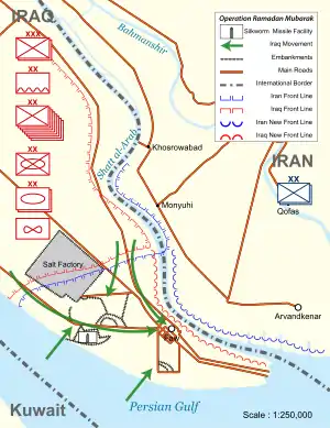 Meanwhile, the regular Iraqi Army's VII Corps attacked the northern end of the line with the 7th Infantry and 6th Armoured Divisions. While the 7th Infantry's attack became bogged down, the 6th Armoured broke through the Iranian lines, the 1st Mechanised Division pushed through, and later linked up with the Republican Guard divisions outside al-Faw. Thus the peninsula had been secured within thirty-five hours, with much of the Iranians' equipment captured intact.[7] The battle saw extensive use of chemical warfare by the Iraqis against the Iranians.