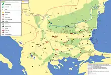 The Ottoman raids renewed in the early 1380s, culminating in the fall of Sofia.[119] Simultaneously, Ivan Shishman had been engaged in war against Wallachia since 1384. According to the Anonymous Bulgarian Chronicle, he killed the Wallachian voivode Dan I of Wallachia in September 1386.[120] He also maintained uneasy relations with Ivan Sratsimir, who had broken his last ties with Tarnovo in 1371 and had separated the dioceses of Vidin from the Tarnovo Patriarchate.[121] The two brothers did not cooperate to repel the Ottoman invasion. According to historian Konstantin Jireček, the brothers were engaged in a bitter conflict over Sofia.[122] Ivan Shishman reneged on his vassal obligation to support the Ottomans with troops during their campaigns. Instead, he used every opportunity to participate in Christian coalitions with the Serbs and the Hungarians, provoking massive Ottoman invasions in 1388 and 1393.