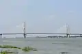 The Second Wuhan Yangtze River Bridge (Chinese: 武汉长江二桥, Wuhan Changjiang Er Qiao) is a bridge across the Yangtze River in Wuhan, Hubei province, China. It is located northeast (downstream) of the historic central area of the city's Hankou District and is the northern crossing for the Inner Ring Road. It is a cable-stayed bridge built of pre-stressed concrete, and has a central span of 400 metres (1,300 ft).[1] It is 4.678 kilometres (2.907 mi) in length (including the 1,876-metre (6,155 ft) main span) and is 26 metres (85 ft) wide. Its main bridgeheads are 90 metres (300 ft) high each, pulling 392 thick slanting cables together in the shape of double fans, so that the central span of the bridge is well-balanced on the piers and the bridge's stability and vibration resistance are ensured.