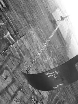 The swing installation came to an end in March 2006 when both the swing and the bar holding it up were removed and a fence installed to block the entrance to the space where the swing was installed.[6] This may have been done to thwart any future attempts to replace the swing, as well as deter homeless people from sleeping in the space between buildings.[7]