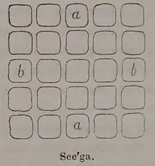 Seega is an abstract strategy game that originated in Egypt. It can be played on boards with cells in a 5×5, 7×7 or 9×9 disposition. Other names include Seejeh, Siga and Sidjah.[1]