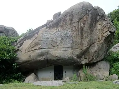 There are two inscriptions found in this hillock.[6] First one is seen near to relief sculptures (right side of Mahaveerar) and it was engraved in Grantha script and Sanskrit language. It is a mixture of prose and poetry. It explains that Rajamalla established two temples for Jinaraja in Vidyadri (hillock) in Saka 815 (892-93 A.D). It also explains Arunkal-anvaya (school of Jain Monks), which was adorned by illustrious pontiffs, who had successfully crossed the vast expanse of the sea of knowledge of all the sciences, belonged to Nandi Sanga of Jinendra Sanga. Though the inscription mentions two temples, the second one is not yet found.