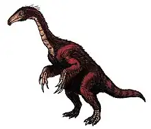 Gregory S. Paul concluded in 1984 that segnosaurs had no theropodan features but were derived, late-surviving Cretaceous prosauropods with adaptations similar to those of ornithischians. He found segnosaurs to be similar to prosauropods in the morphology of their snout, mandible, and hindfoot; to ornithischians in their cheek, palate, pubis, and ankle; and to early dinosaurs in other respects. He proposed that ornithischians were descended from prosauropods and that the segnosaurs were an intermediate relic of this transition, which supposedly took place during the Triassic period. In this way, he considered segnosaurians to have a comparable position to herbivorous dinosaurs in general, as monotremes have to mammals. He found it unlikely but did not rule out that segnosaurs could have derived from theropods or that segnosaurs, prosauropods and ornithischians were each independently derived from early dinosaurs.[21] David B. Norman considered Paul's idea contentious and "bound to provoke much argument" in 1985.[22] In 1988, Paul maintained that segnosaurs were late-surviving, ornithischian-like prosauropods and proposed a segnosaurian identity for Therizinosaurus. He also placed segnosauria within Phytodinosauria, a superorder Robert Bakker had created in 1985 to contain all plant-eating dinosaurs.[23] In a 1986 study of the inter-relationships of saurischian dinosaurs, Jacques Gauthier concluded segnosaurs were prosauropods. While he conceded they had similarities with ornithischians and theropods, he proposed these features had evolved independently.[24] In a 1989 conference abstract about sauropodomorph inter-relationships, Paul Sereno also considered segnosaurs to be prosauropods, based on skull features.[25]