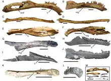 Segnosaurus was distinct among therizinosaurs in that the hindmost part of the dentary was toothless. The teeth were restricted to the front two-thirds of the dentary, which bore 24 alveoli (tooth sockets) in a manner similar to Jianchangosaurus but different from Erlikosaurus, in which nearly the entire dentary was toothed, bearing 31 alveoli. The tooth row of Segnosaurus was inset and demarcated by a shelf on the outer side as it was in all derived (or "advanced") therizinosaurs. Unlike in other related taxa, the shelf was restricted to the hind part of the dentary and the raised rim that defined it was not as pronounced. Segnosaurus was unique in having a low ridge rising between the fifth and fourteenth alveoli that divided the dentary into two almost-equally sized front and hind parts. Just above this ridge, the dentary was pierced by a row of foramina as in Jianchangosaurus and Alxasaurus, which became less regular by the region around the mandibular symphysis, where the two halves of the mandible met at the front. This row was instead directly in line with and on the side of the ridge in Erlikosaurus. The Meckelian groove that ran along the inner side of the mandible, was placed further down than in Erlikosaurus and had a consistent depth until the thirteenth tooth position, whereafter it widened. The lower jaw elements behind the dentary (the splenial, surangular, angular, and prearticular bones) were distinct from those of other therizinosaurs, being gracile and linear, and contributing to the hind part of the hemimandible being elongate and almost rectangular.[6] The surangular was long and sword-shaped, the angular was wing-like in shape, the prearticular was narrow and curved, and the splenial was thin and triangular in outline. The external mandibular fenestra, an opening at the outer side of the mandible, was larger than that of Erlikosaurus because the surangular was shallow from top to bottom.[1]