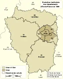 Seine-et-Oise (French pronunciation: [sɛn‿e waz]) is a former department of France, which encompassed the western, northern and southern parts of the metropolitan area of Paris.[1] Its prefecture was Versailles and its administrative number was 78. Seine-et-Oise was disbanded in 1968 as part of the reorganisation of the departments of the Paris metropolitan area. The newly-created Yvelines department inherited the 78 number.[2]