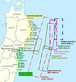 Quakes of large magnitudes in the Sanriku region can have a rupture length of hundreds of kilometers; and this generally requires a long, relatively straight fault surface. However, the plate boundary and subduction zone in this area is not very straight.[16] The "epicentral region" of an earthquake is defined as an elliptical area which encompasses the location of highest felt intensity of an earthquake. This term is used for identifying the likely epicenter for earthquakes and tsunami in the history of the Sanriku coat.