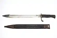 The Seitengewehr 98 is a bayonet that accompanies the Gewehr 98, a German bolt-action rifle made by Mauser. It was superseded by the short-lived Seitengewehr 98/02, with a shorter and sturdier 44 cm (17 in) blade. Seitengewehr 98/05 followed shortly, with a still-substantial 37 cm (15 in) blade. All Mauser bayonets attached via a T-shaped bar fitted under the barrel. Although many bayonets of the time used a muzzle ring, Mauser avoided one since these altered the vibration harmonics of the barrel when fired, affecting accuracy. All the bayonets featured quillons that curved back towards the hilt. These were much less effective at catching the opposing blade than the forward-swept quillons used by some other nations.[1] A small number of pioneers and certain non-commissioned officers of the German Army were issued a bayonet with a sawback edge, known as the S or m.S. ("mit Säge", with saw). Many such bayonets had their teeth ground down in response to negative Allied propaganda.[2]