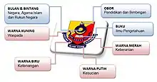 The logo consists of a red “Old French” escutcheon (shield) with yellow per bend sinister motive. A blue circle with the crescent and the 14-pointed Federal Star (Bintang Persekutuan) is located in the middle of the shield. Above the circle lies a glaring red flame of a torch. Below the circle, an opened book is placed. Located below the book is a small blue banderole bearing the motto of the school ‘Chita Usaha Jaya’.