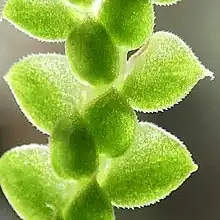 It is in the genus Selaginella and this creeper is characterized by having flattened stems, bearing four rows of ovate leaves which vary in size according to their position. Its specific epithet, "denticulata" comes from the Latin "dens" which means tooth, and alludes to the denticles that appear on the leaves. It was identified by the nineteenth century botanist Antoine Frédéric Spring.
