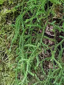 Selaginella oregana is a species of spikemoss known by the common name Oregon spikemoss.[1] It is native to the Pacific Coast of western North America, where it can be found from British Columbia to northern California. It grows in mossy, shady coastal forests. It is often epiphytic, growing attached to tree branches, its stems hanging in sheets of green, mosslike streamers. Trees commonly occupied by the spikemoss include bigleaf maple (Acer macrophyllum), black cottonwood (Populus trichocarpa), and red alder (Alnus rubra).[2] It also grows on the ground and on rocks in carpetlike mats. This lycophyte has creeping or hanging stems up to about 60 centimeters long, usually with forking branches. They curl as they dry. The stems are radially symmetric, with spirals of lance-shaped leaves each measuring 2 or 3 millimeters in length and tipped with a tiny, rigid bristle. The strobili containing the reproductive structures are up to 6 centimeters long and often occur in pairs.