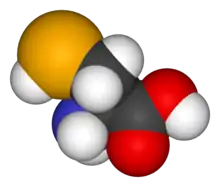 Selenocysteine is the Se-analogue of cysteine. It is rarely encountered outside of living tissue (and is not available commercially) because it is very susceptible to air-oxidation. More common is the oxidized derivative selenocystine, which has an Se-Se bond.[8] Both selenocysteine and selenocystine are white solids. The Se-H group is more acidic (pKa = 5.43[2]) than the thiol group; thus, it is deprotonated at physiological pH.[9]