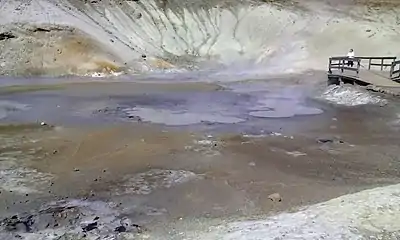 The hot springs area contains solfataras, bubbling mud pools, fumaroles, hot springs and warm springs. The high sulphur content of the springs give them a characteristic yellow-orange color. Sulfur was mined at this location until the 1880s. An explosion caused by nearby drilling took place in 1999 that opened up a large crater vent. In 2010 and 2019 other explosions took place, spewing hot mud, water and steam over the area.[1]