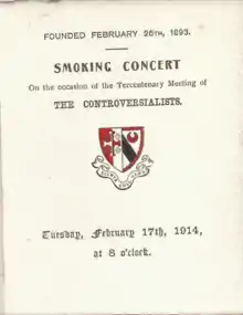 The Controversialists commonly organise smoking concerts where poetry and verse is recited by members before the political discussions begin. The Controversialists are said to drink only port during their meetings.