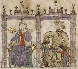 The manuscript is made of parchment and consists of 44 folios. Each page has two biographies in parallel columns beneath an image of both rulers.[4] The text is written in Gothic cursiva textualis, with the only decorated initials at the start of the prologue and the first biography. Beneath the first biographies there is an unidentified coat of arms—probably indicating that the original owner was from the Lordship of Biscay.[7] The iconography of the manuscript is stereotyped and repetitive.[2] The drawing is rough but colourful with ample use of gold.[8] All the kings are depicted enthroned in a niche with Gothic characteristics.[2][4] Most have long hair and beards.[2] They all carry either a sceptre or a sword and either an orb or a book. The greatest variation is found in the headdresses.[4] The counts of Castile and Portugal, for example, do not wear crowns. There is other variation in the details. The swords vary between sheathed and unsheathed, and the design of the sceptres and orbs varies.[9]